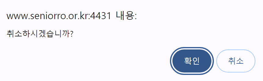 만약 해당 노인 일자리에 지원을 취소하고 싶으신 경우 사진에 보이시는 [신청취소] 버튼을 누르시면 됩니다. [신청취소] 버튼을 누르시면 다음과 같이 신청을 재 확인하는 질문이 나오며, 여기서 확인을 누르시면 됩니다.