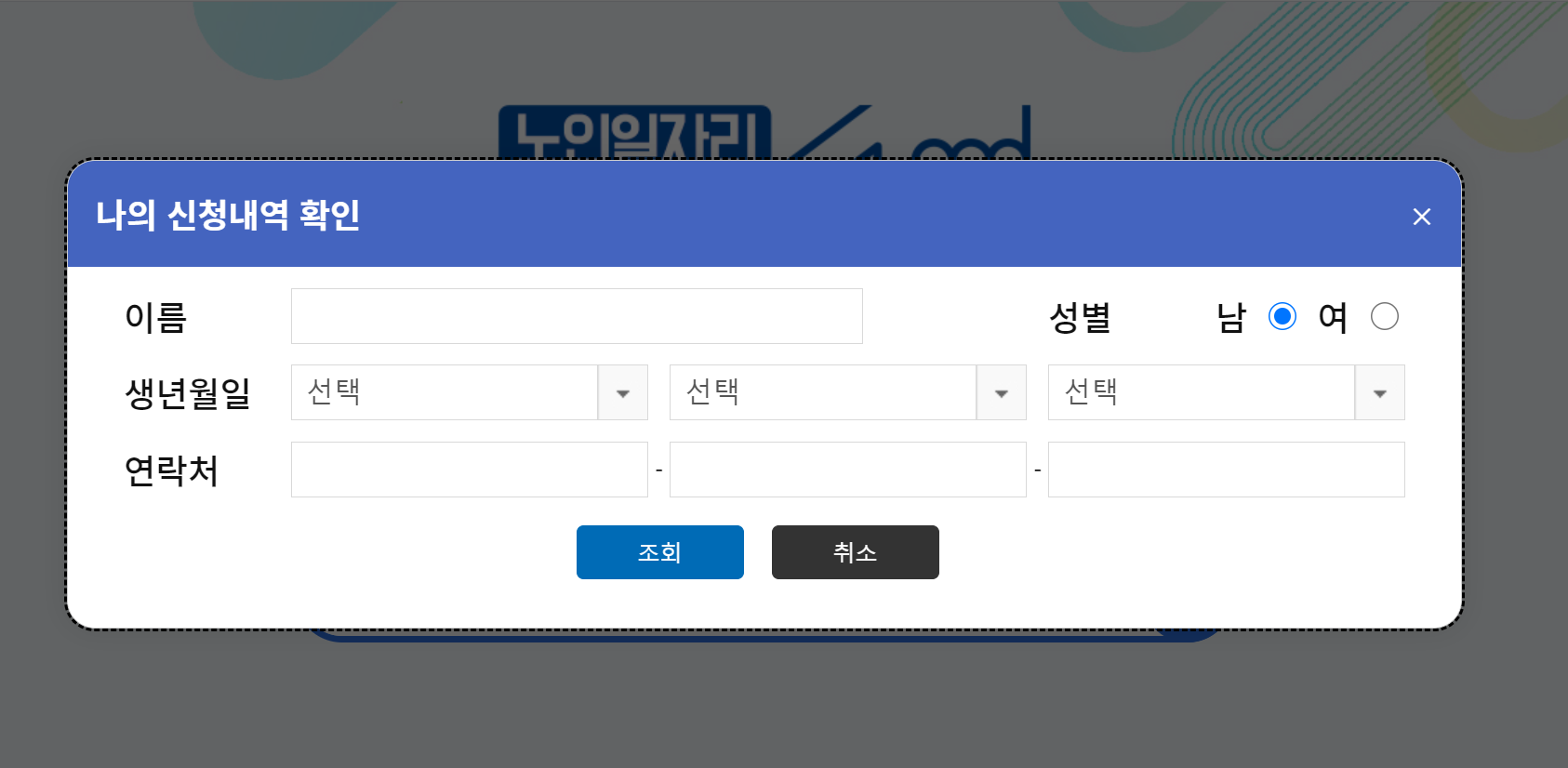 해당 메뉴를 클릭하시면 아래의 사진과 같이 나의 신청 내역을 확인하기 위한 메뉴가 하나 나옵니다. 여기에 신청하실 때 기입하셨던 정보를 그대로 입력해줍니다.