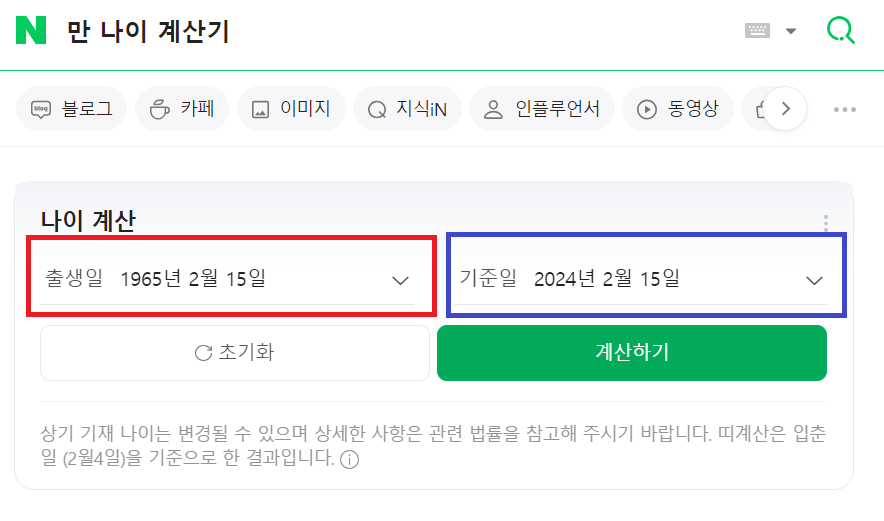 다음으로 파란색 네모 박스 안의 날짜를 오늘 날짜로 입력하시고 아래의 [계산하기]를 누르시면 오늘 일자를 기준으로 한 자신의 만 나이를 알 수 있습니다. 지원 자격의 나이 요건을 충족할 경우 다시 아래 사진처럼 채용 상세정보 및 접수 화면으로 돌아가시면 됩니다.