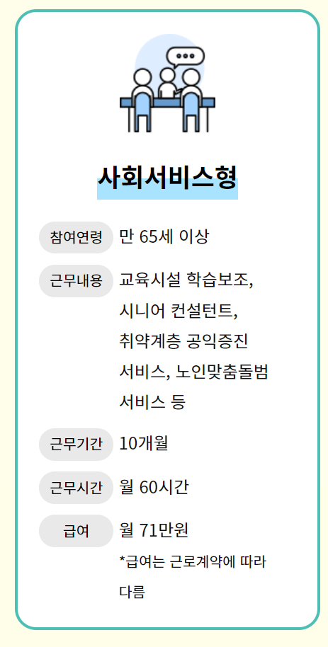 사회서비스형 노인 일자리(시니어 일자리)는 말그대로 사회 각 분야에서 서비스를 제공하는 채용 형태입니다. 근무 내용을 예로 들면 교육 시설의 학습보조, 취약계층 공익 증진을 위한 활동 등이 있습니다. 근무 기간은 약 10개월, 근무시간은 월 60시간입니다. 급여는 약 월 71만 원 정도이지만 채용 및 계약의 형태에 따라 다를 수 있습니다. 아래의 사례를 보시면 바로 이해하실 수 있습니다.